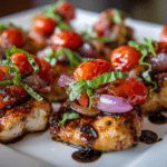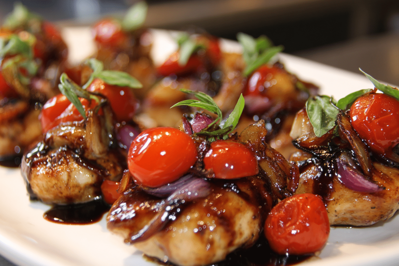 An easy one-skillet recipe featuring seared chicken, cherry tomatoes, and onions roasted in a balsamic and honey glaze for a flavorful, no-fuss dinner.