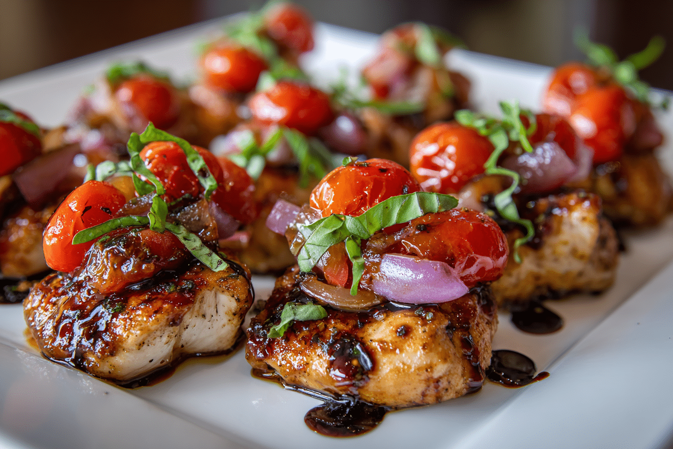 An easy one-skillet recipe featuring seared chicken, cherry tomatoes, and onions roasted in a balsamic and honey glaze for a flavorful, no-fuss dinner.
