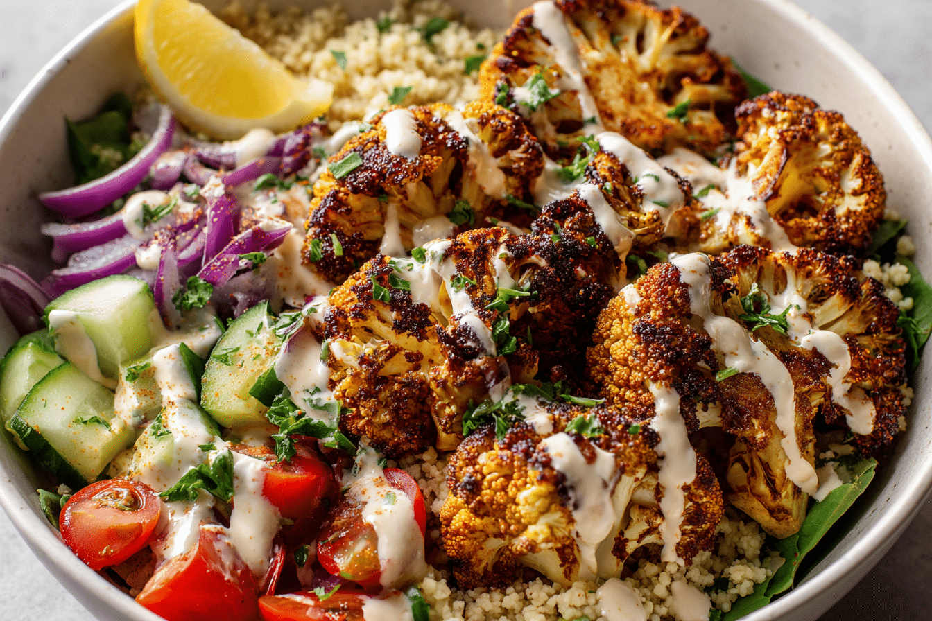 Each bowl layers savory, spiced cauliflower with tender grains, crunchy vegetables, and creamy sauces, offering a satisfying meal that’s as vibrant as it is nourishing. It’s a celebration of color, texture, and comfort—all in one dish.
