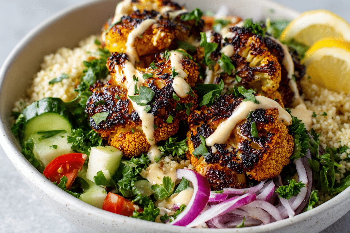 Each bowl layers savory, spiced cauliflower with tender grains, crunchy vegetables, and creamy sauces, offering a satisfying meal that’s as vibrant as it is nourishing. It’s a celebration of color, texture, and comfort—all in one dish.