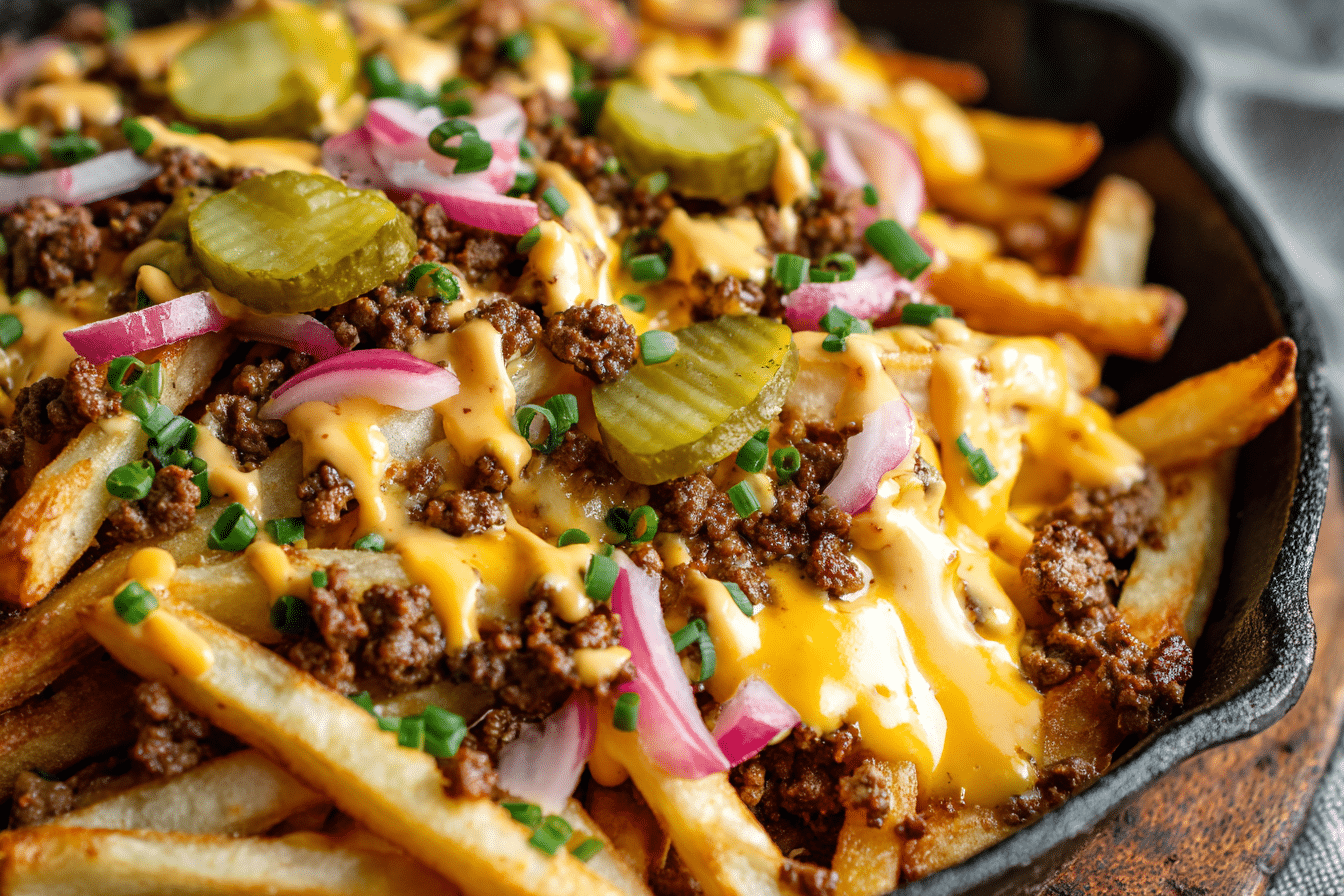 A flavorful one-pan meal combining seasoned ground beef, crispy French fries, and melted cheddar cheese—topped with all your favorite burger fixings.