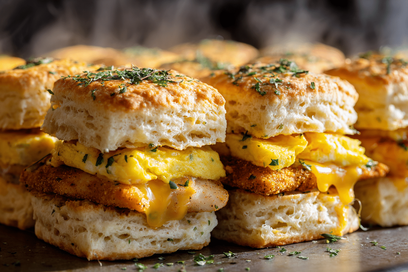 Savory biscuit sliders filled with crispy chicken, fluffy scrambled eggs, melted cheese, and buttery biscuit layers—perfect for any morning occasion.