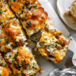 Every forkful is loaded with fluffy scrambled eggs, golden biscuits, savory chicken sausage, and melted cheddar. It’s a perfect recipe for busy mornings, lazy Sundays, or feeding a hungry brunch crowd. What makes it even better? It’s effortless to prepare—minimal chopping, easy cleanup, and ready in under an hour.
