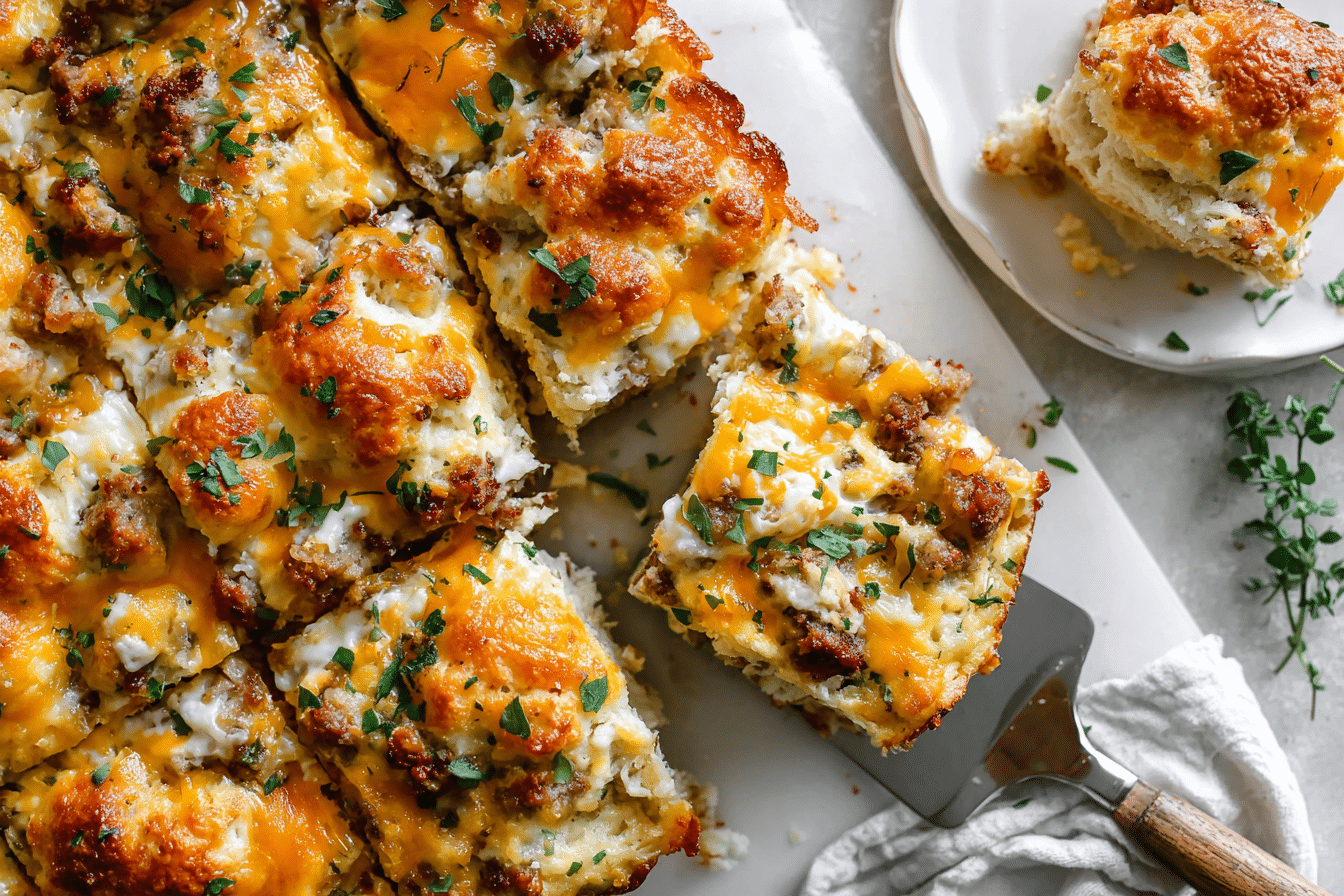 A warm, savory breakfast bake packed with eggs, chicken sausage, sharp cheddar, and biscuit pieces. Great for brunch or make-ahead meals.