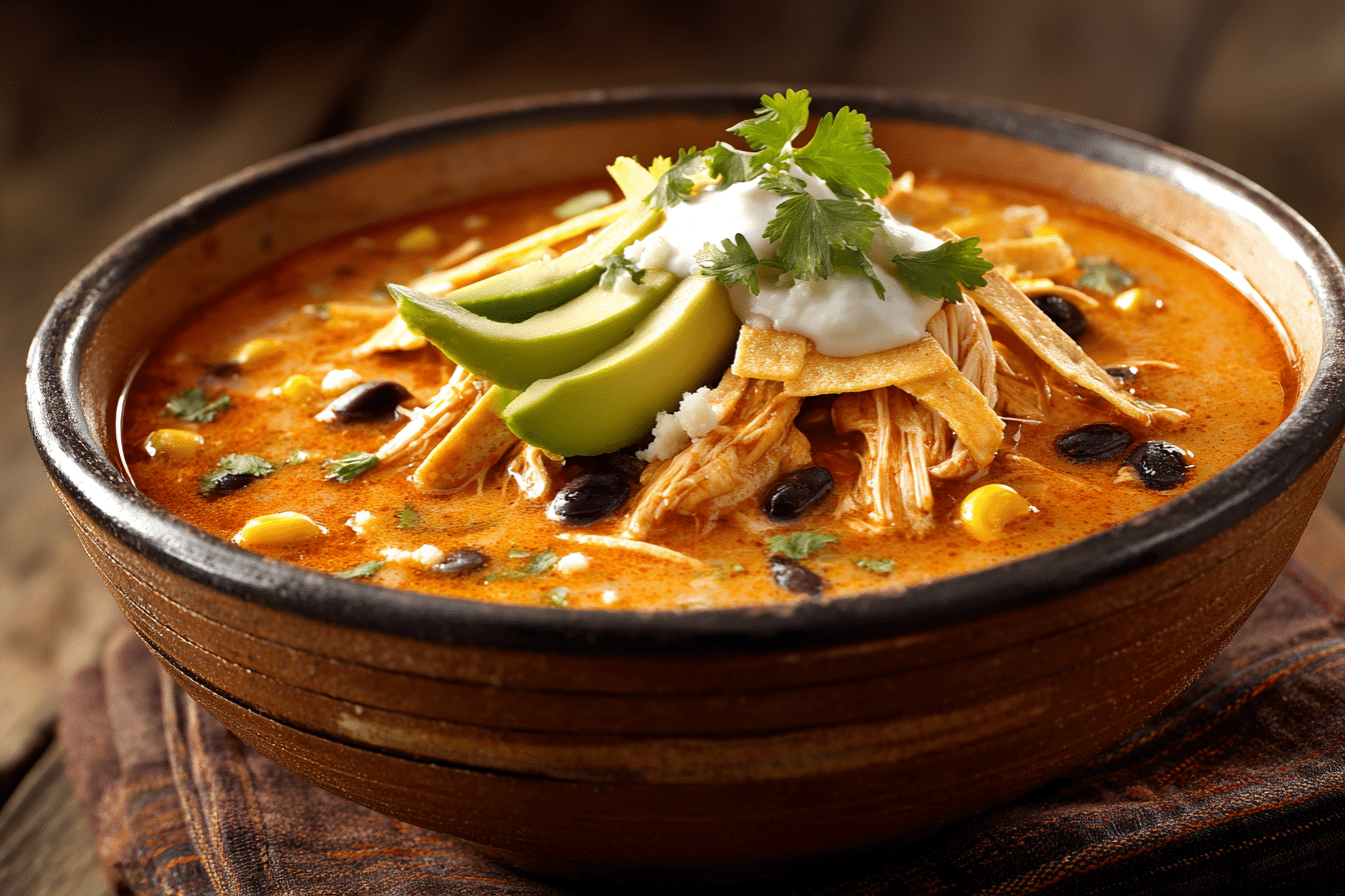 A creamy, smoky chicken tortilla soup filled with shredded chicken, black beans, corn, and three cheeses—all simmered in a bold, seasoned broth and topped with crunchy tortilla strips and fresh garnishes.