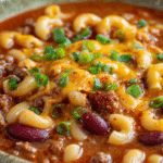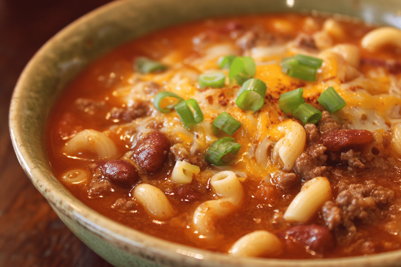 Every spoonful is loaded with ground beef, soft macaroni, melty cheddar, and a chili-infused tomato broth that’s just spicy enough to wake up your taste buds. It’s rich without being too heavy, and the mix of textures—tender noodles, creamy beans, and juicy beef—makes it deeply comforting.
