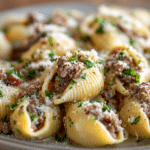 Think tender pasta shells coated in a creamy tomato sauce, speckled with seasoned ground beef, melted cheese, and just the right hint of spice. It’s the kind of meal that’s ready in under 40 minutes, makes plenty of leftovers, and keeps everyone coming back for seconds.