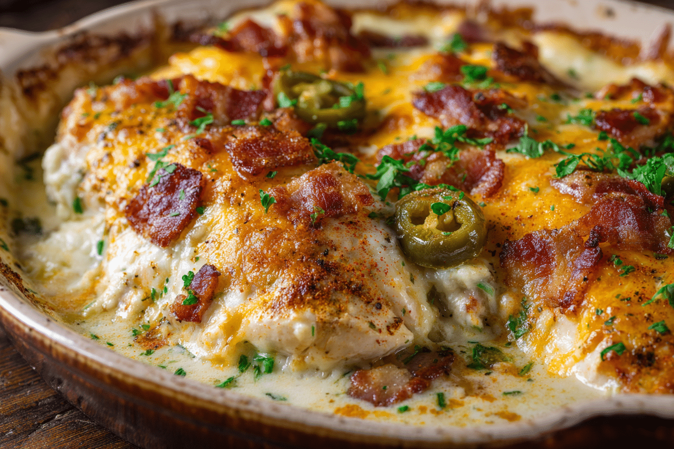 Creamy Jalapeño Popper Chicken Bake turns spicy jalapeños, smooth cream cheese, melty cheddar, and crispy bacon into a rich topping over juicy baked chicken. It’s an easy, flavor-packed dinner with just the right amount of heat.
