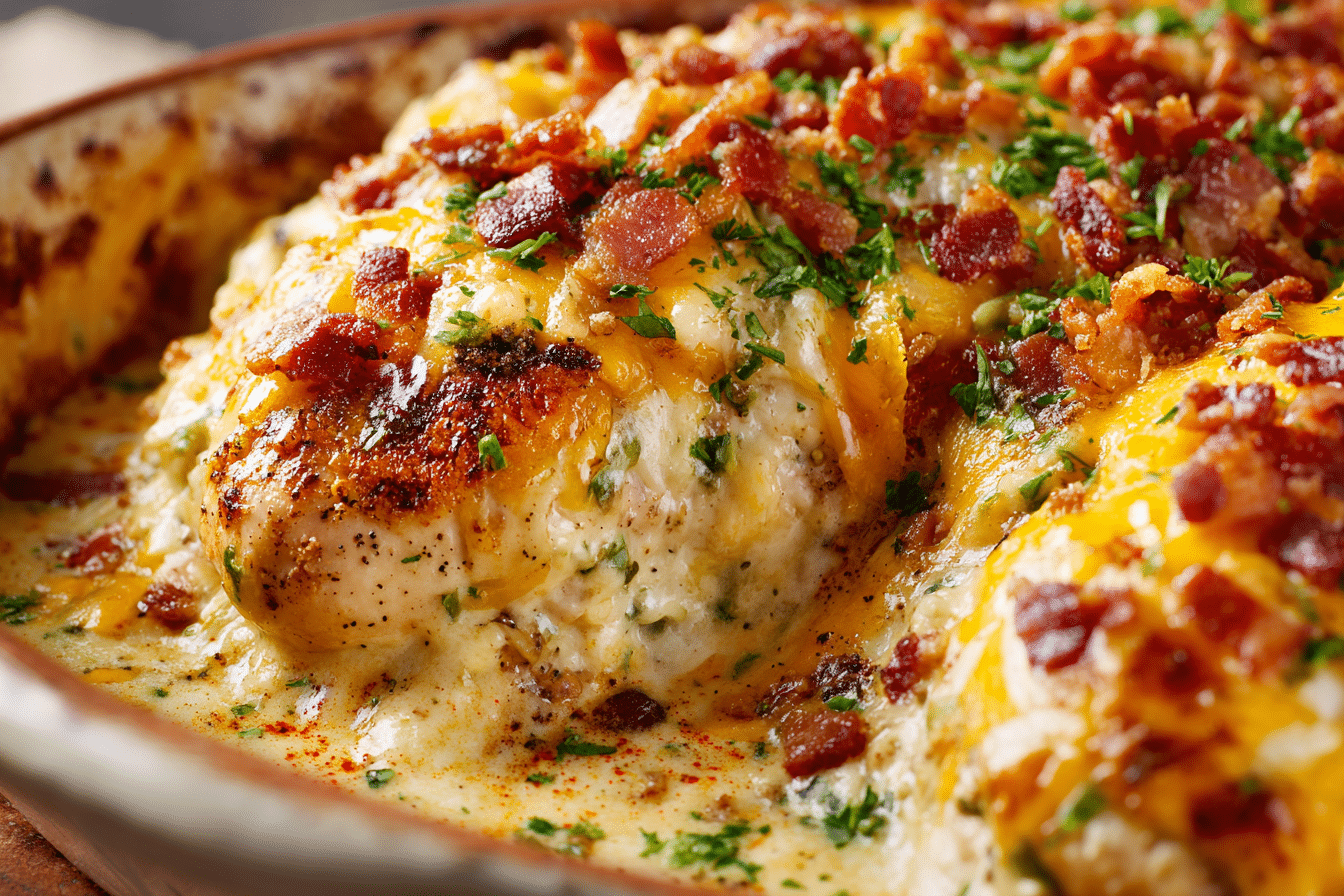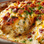 Spoon the creamy mixture over each piece of chicken, spreading it evenly so it covers the tops. Sprinkle the remaining shredded cheese and bacon over the creamy layer.
