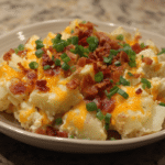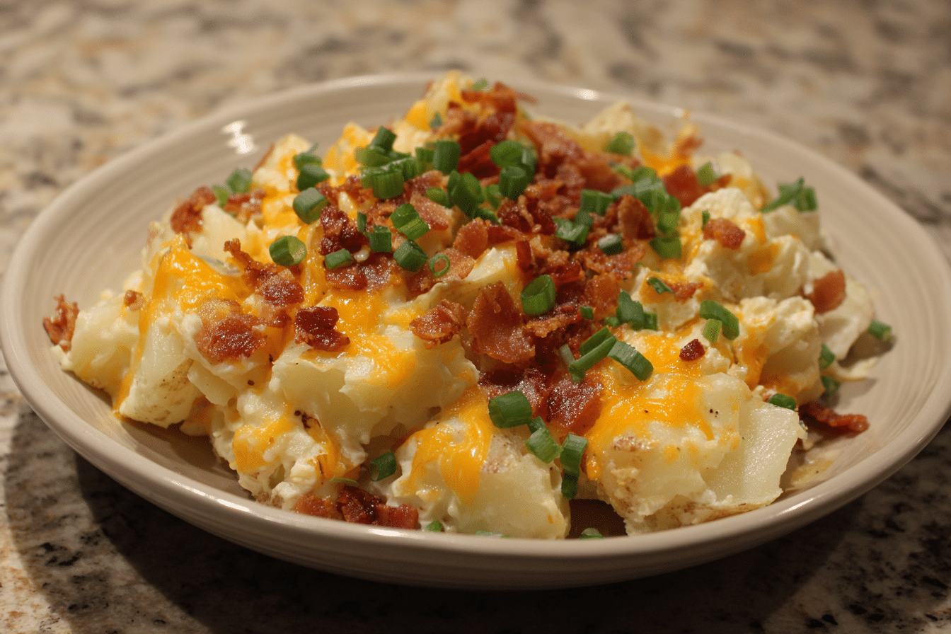 A creamy, slow-cooked potato dish loaded with melted cheeses, sour cream, and simple ingredients, perfect for comfort food lovers.