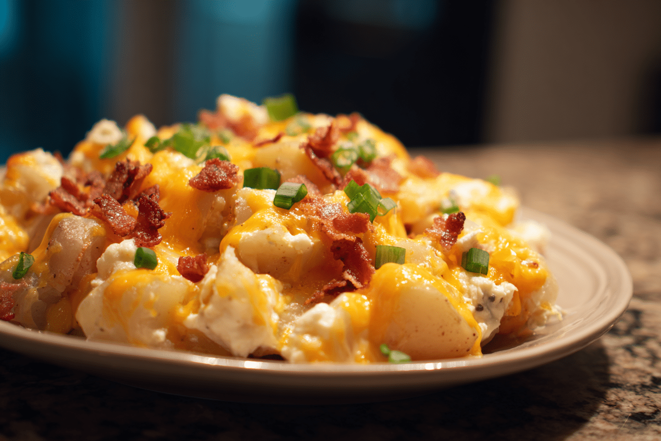 A creamy, slow-cooked potato dish loaded with melted cheeses, sour cream, and simple ingredients, perfect for comfort food lovers.