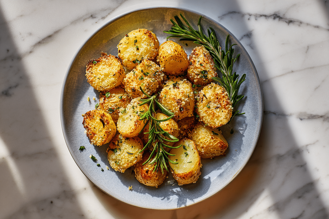 Potatoes are rich in vitamin C, potassium, and fiber. Parmesan adds protein and calcium, while butter and olive oil contribute healthy fats. Portion control and pairing with vegetables or lean proteins make this a balanced dish. Using less cheese or substituting olive oil for butter can reduce saturated fat content while maintaining flavor.