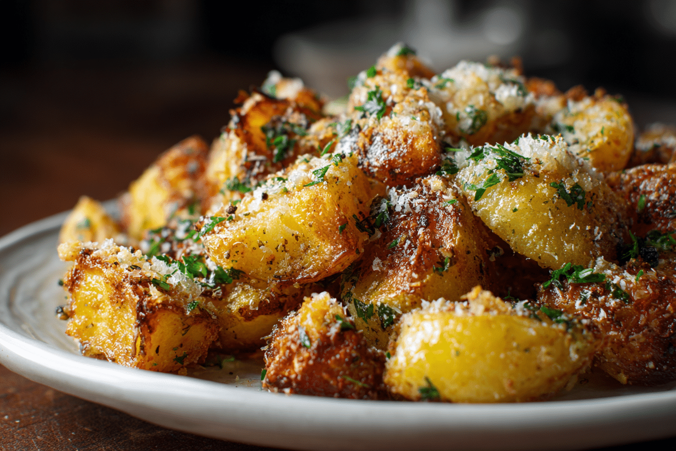 Potatoes are rich in vitamin C, potassium, and fiber. Parmesan adds protein and calcium, while butter and olive oil contribute healthy fats. Portion control and pairing with vegetables or lean proteins make this a balanced dish. Using less cheese or substituting olive oil for butter can reduce saturated fat content while maintaining flavor.