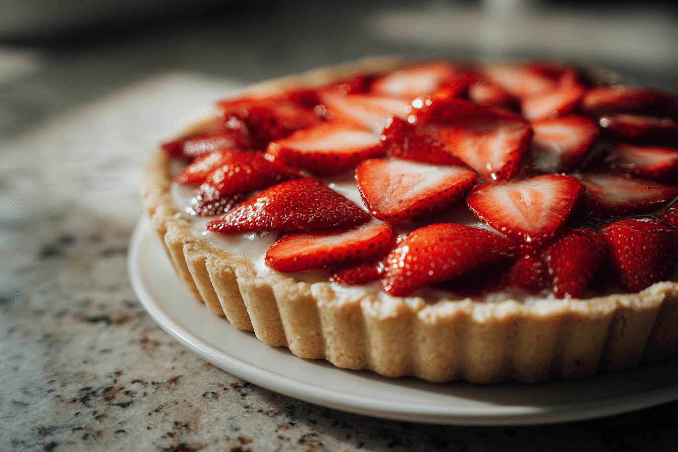 The shortbread crust is made with cold butter, which contributes to a tender, crumbly texture. The butter works with the flour and sugar to create a light yet sturdy base for the strawberries. Vanilla extract adds a gentle aroma, enhancing the richness of the crust. For variety, almond flour can replace part of the all-purpose flour for a nutty undertone, or coconut sugar can be used for a subtle caramel flavor.