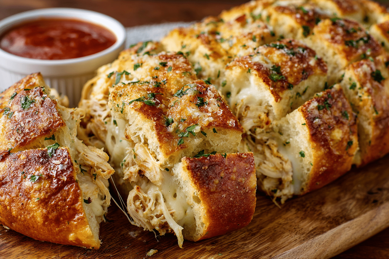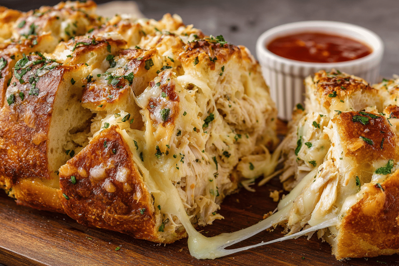 A warm, crusty loaf packed with creamy chicken, melty mozzarella, and flavorful garlic butter—perfect for dinner, game night, or a sharable snack.