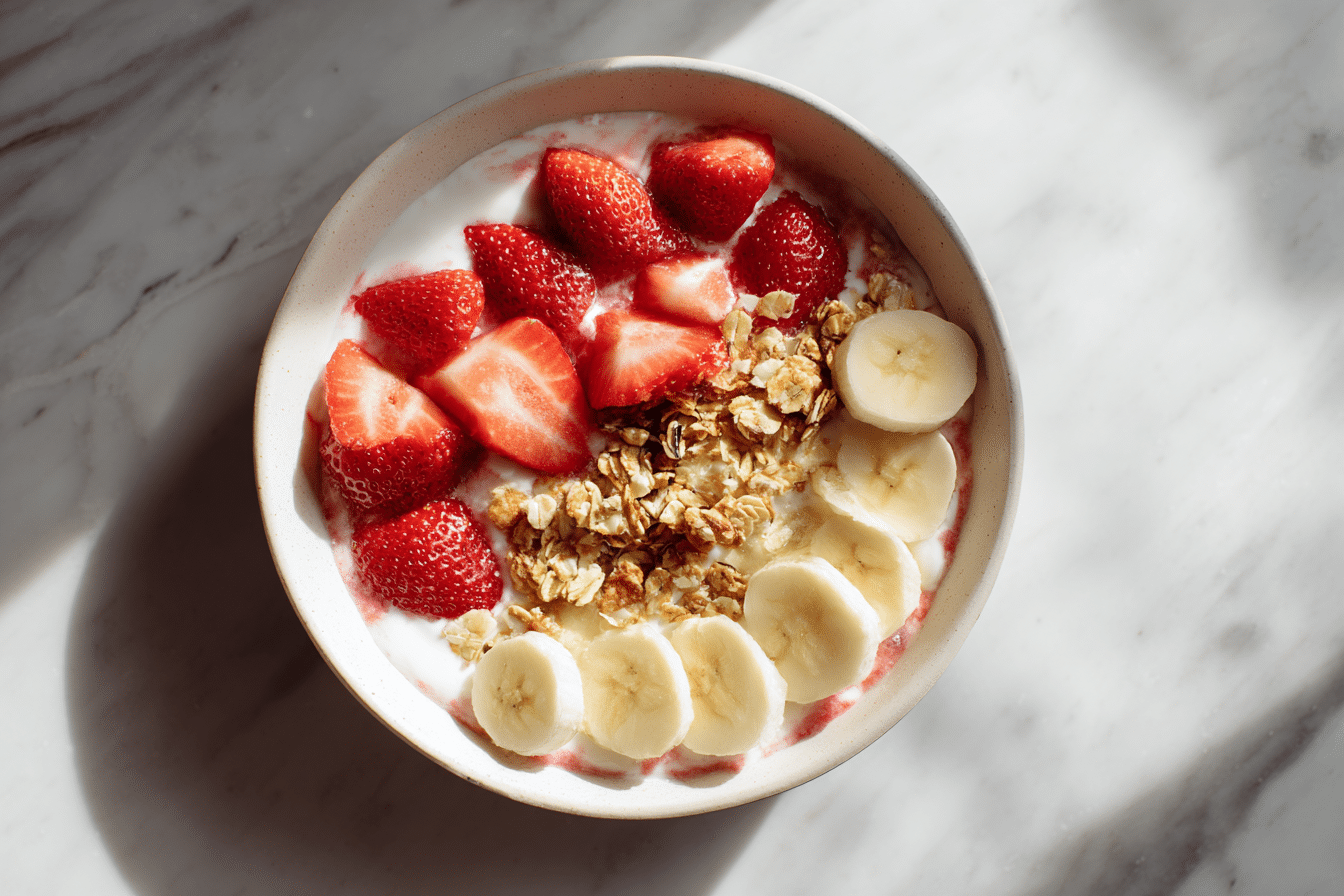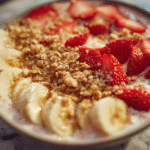 This smoothie bowl is naturally rich in potassium, fiber, and antioxidants. Bananas provide energy-boosting carbohydrates, while strawberries contribute vitamin C and antioxidants. Greek yogurt increases protein content, helping maintain fullness throughout the morning. Chia seeds add healthy fats and extra fiber, supporting digestion and sustained energy.