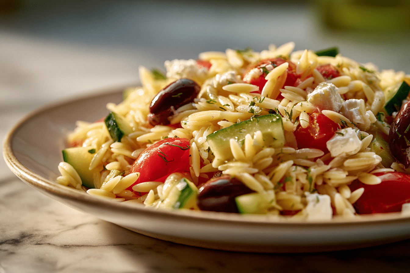 Orzo pasta is the foundation of this dish. Although shaped like rice, it is a small pasta that cooks quickly and has a tender bite when prepared correctly. Its mild flavor allows it to absorb dressing without becoming heavy or sticky.