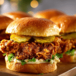 Crispy fried chicken thighs coated in a golden crust and topped with warm honey butter, all tucked inside toasted brioche buns. A sweet and savory sandwich that’s comforting and full of crunch.