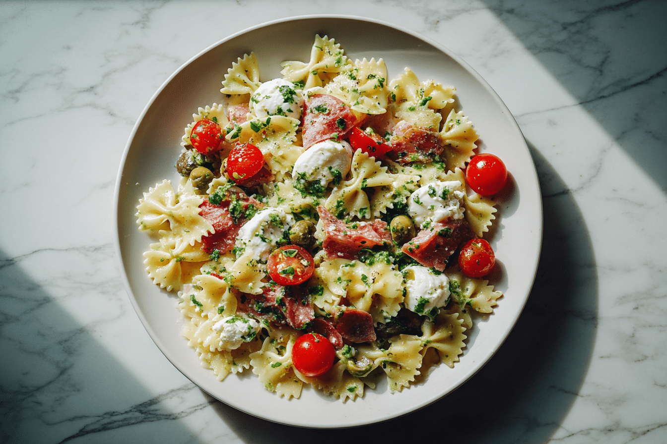 Italian Bow Tie Pasta Salad is a chilled pasta dish built around tender farfalle, crisp vegetables, creamy cheese, and a light herb dressing. Each bite carries a mix of textures, from soft pasta folds to crunchy vegetables and smooth mozzarella, creating a balanced cold dish that works well for gatherings, lunch prep, or shared meals.