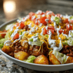 A Loaded Potato Taco Bowl is a warm, filling meal built from seasoned ground meat, oven-roasted potatoes, and a mix of fresh toppings layered together in one satisfying dish. It brings together familiar ingredients in a way that feels balanced and easy to prepare ahead of time.