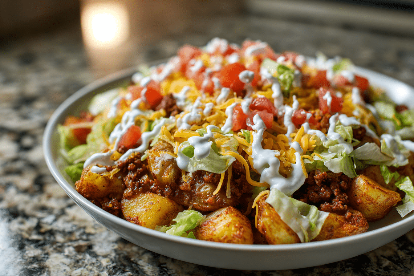 The base of roasted potatoes gives structure and comfort, while taco-seasoned meat adds savory depth. Fresh toppings bring contrast so each bite has both richness and brightness.
