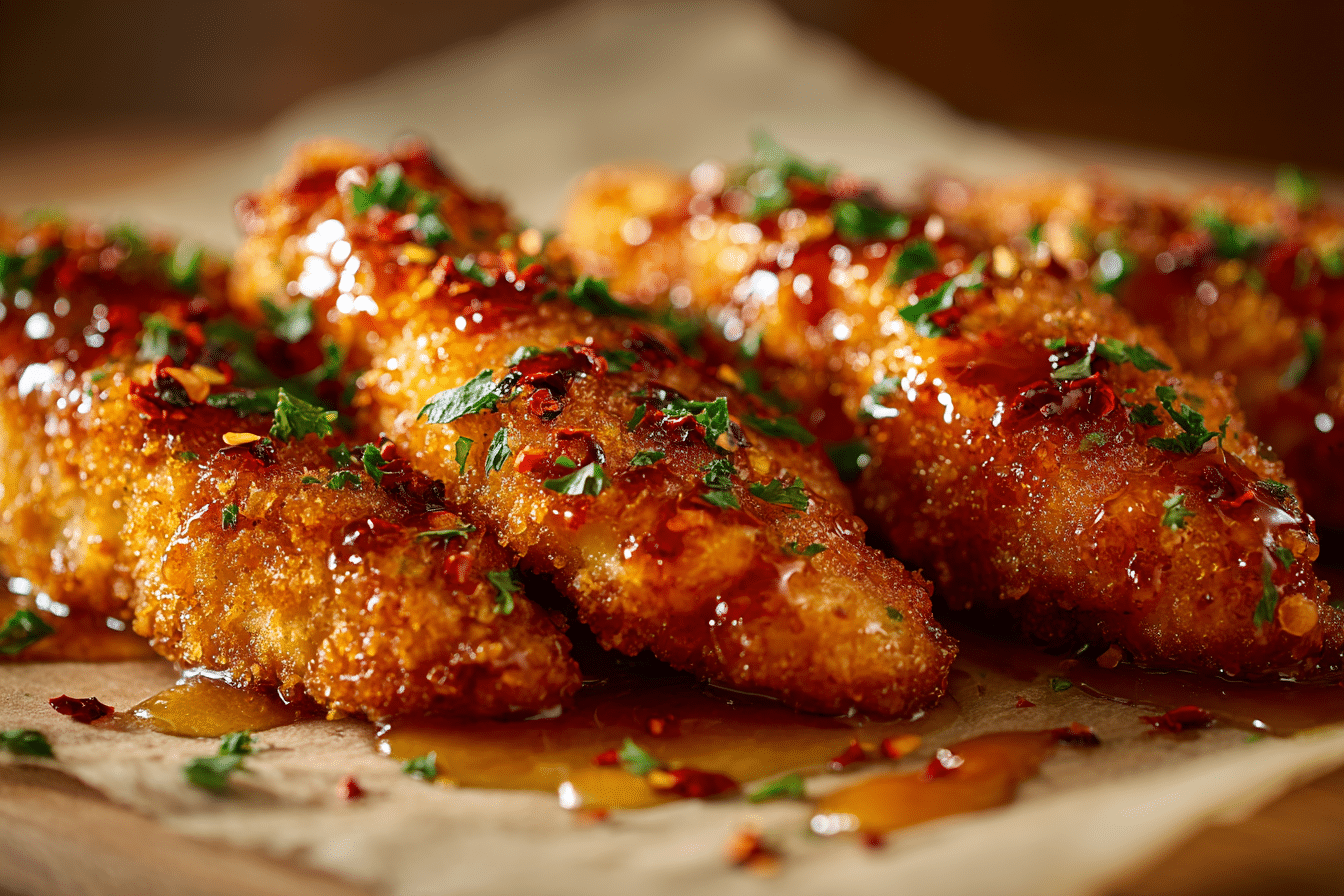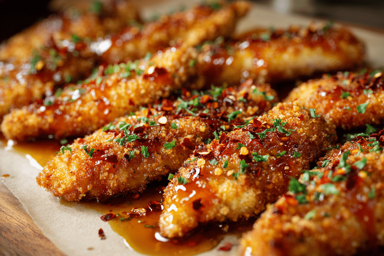 Baked Nashville Hot Honey Chicken Tenders are spicy, crispy, and glazed with sweet-hot honey butter. A simple oven-baked recipe that delivers Southern comfort with bold flavor and irresistible texture.