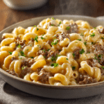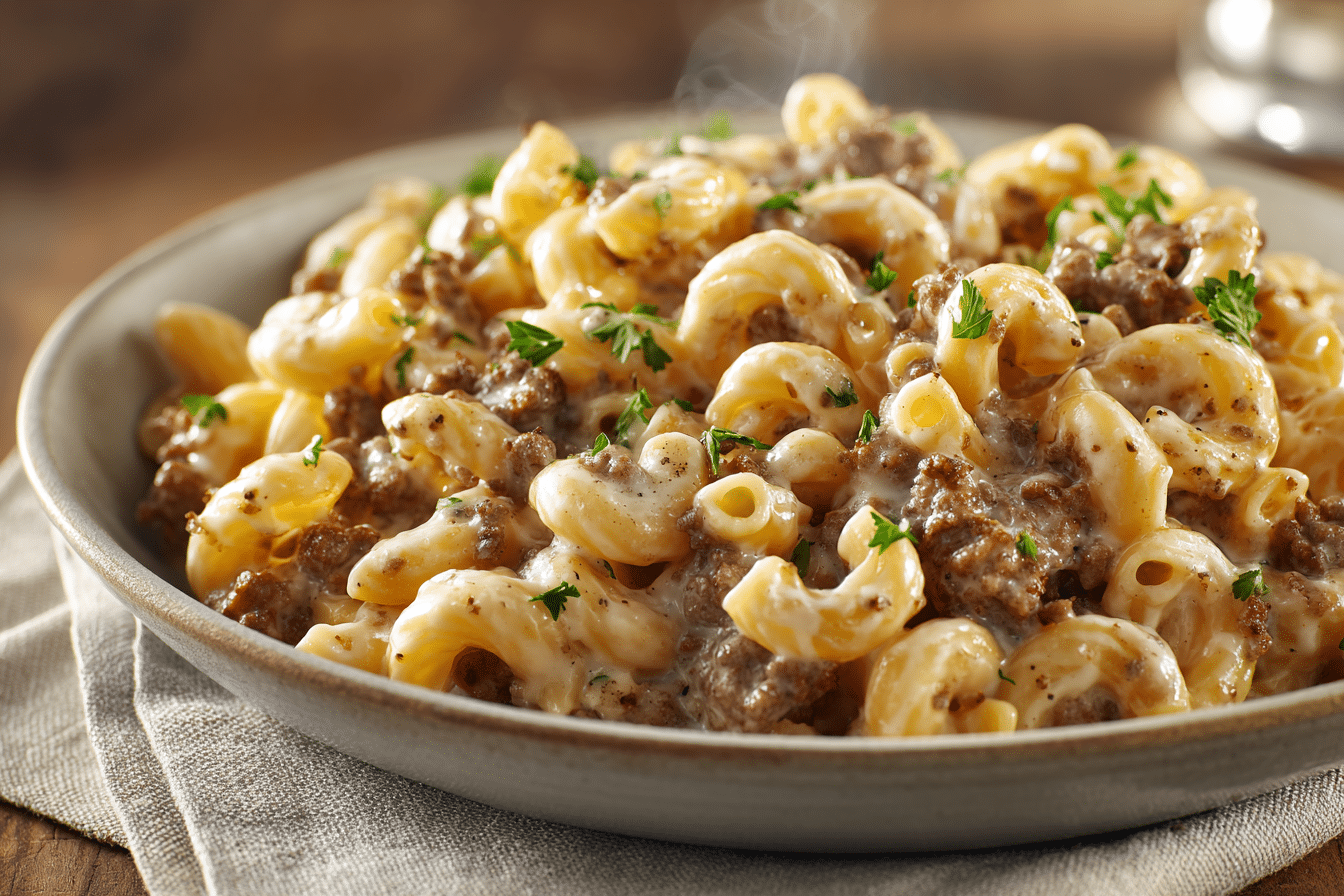 A creamy, cheesy one-pot pasta dish with ground beef, cheddar, and tender macaroni. It’s a homemade take on a nostalgic family favorite — fast, filling, and made from scratch.