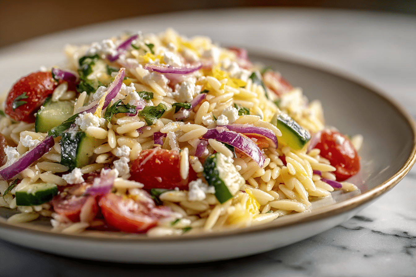 This dish stands out because it stays light while still feeling satisfying. The orzo holds onto the dressing, the vegetables add crunch and color, and the herbs bring a fragrant note that lifts the entire bowl. It can be served cold or at room temperature, which makes it practical for warm weather meals or busy schedules.