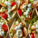This recipe brings together Mediterranean-inspired flavors with an all-American twist. The chicken is roasted on a single sheet pan with peppers and onions until beautifully golden, then tucked into soft pita pockets or wraps with crunchy lettuce and drizzled with a tangy herby ranch dressing that’s bursting with fresh flavor.