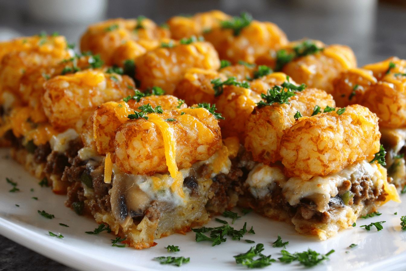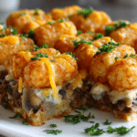 Bake: Place the dish in the oven and bake uncovered for 40–45 minutes. The tater tots should be golden and crisp, and the filling bubbling.