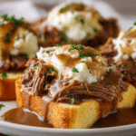 The Beef Manhattan Sandwich is pure Midwestern comfort: fork-tender shredded beef, buttery white bread, creamy mashed potatoes, and a generous pour of rich brown gravy. Originally a diner favorite from the heartland, this open-faced sandwich brings nostalgic, stick-to-your-ribs satisfaction—and it’s surprisingly easy to make in the slow cooker.