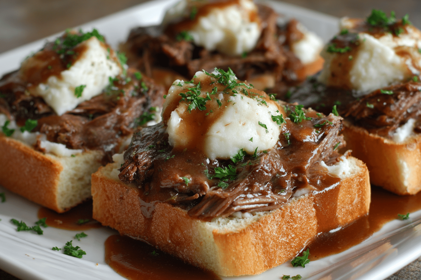 A classic open-faced sandwich featuring slow-cooked shredded beef, creamy mashed potatoes, and savory brown gravy layered over soft white bread. A hearty, old-fashioned comfort meal.