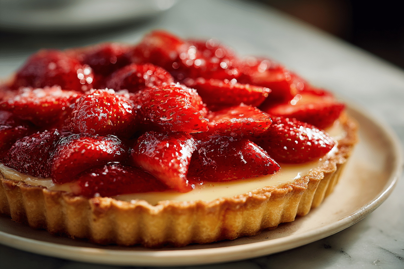 Fresh strawberries are the highlight. Pick ripe, firm, and aromatic berries for optimal flavor and color. To prevent the custard from becoming soggy, arrange the strawberries just before serving. When strawberries aren’t in season, other berries like raspberries or blueberries can substitute. A simple glaze, such as warmed apricot jam, can add shine and help preserve freshness.